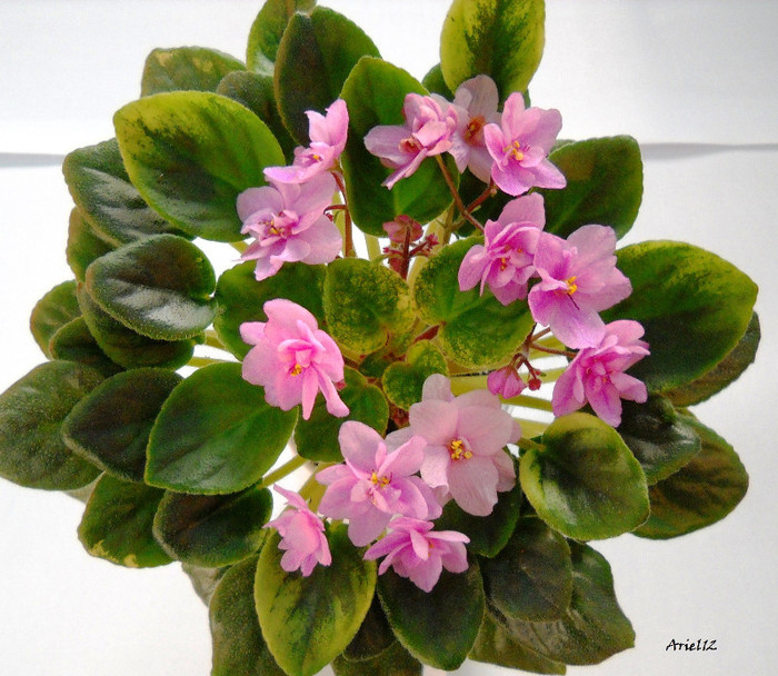 (I. Fredette) Double rose-pink. Variegated bright green, cream and white. Standard trailer.