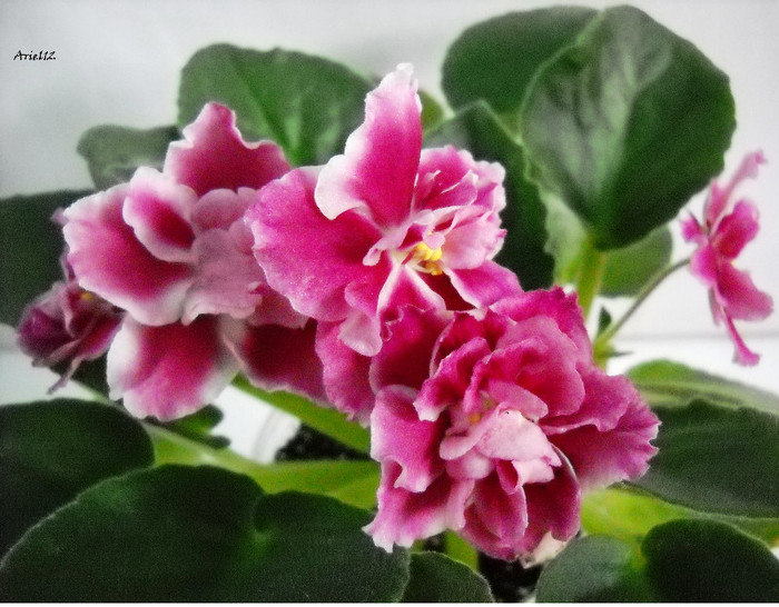 (K. Morev) Semidouble and double cherry-red flowers with white eye and edge.